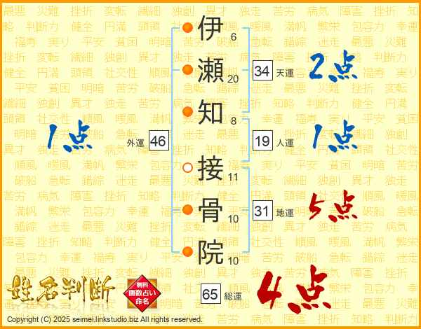 伊(6画)瀬(20画)知(8画) 接(11画)骨(10画)院(10画)