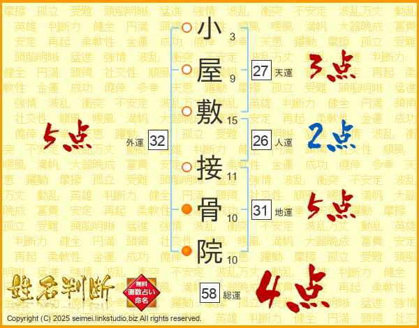小(3画)屋(9画)敷(15画) 接(11画)骨(10画)院(10画)