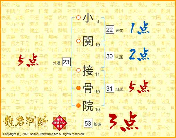 小(3画)関(19画) 接(11画)骨(10画)院(10画)
