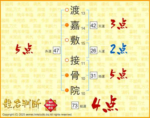 渡(13画)嘉(14画)敷(15画) 接(11画)骨(10画)院(10画)
