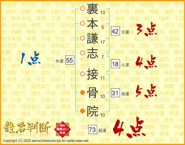 裏(13画)本(5画)謙(17画)志(7画) 接(11画)骨(10画)院(10画)