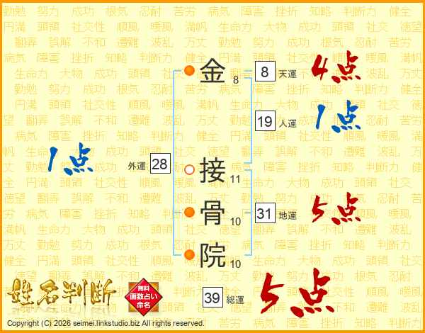 金(8画) 接(11画)骨(10画)院(10画)