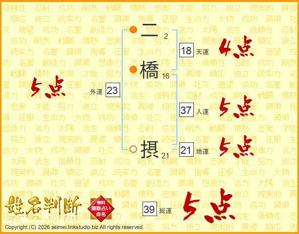 家系が持つ宿命的な運勢を表します。祖先から受け継いだ苗字ですので自分の力が及びません。家柄を象徴します。苗字の合計画数。