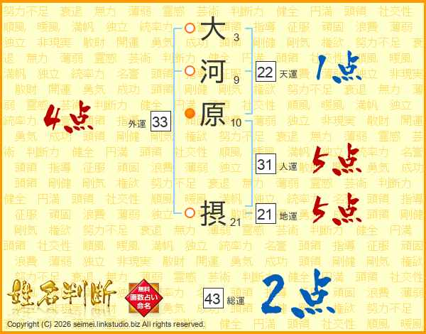 生活面を象徴する運勢です。外部から受ける影響力を表し、結婚運、家庭運や職場、環境への順応性を表します。総運から人運を引いた画数。姓や名が1文字の場合を除く。