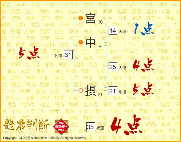 生活面を象徴する運勢です。外部から受ける影響力を表し、結婚運、家庭運や職場、環境への順応性を表します。総運から人運を引いた画数。姓や名が1文字の場合を除く。