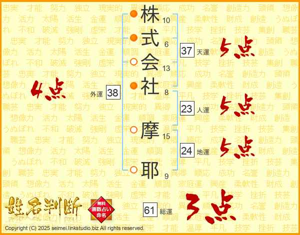 株(10画)式(6画)会(13画)社(8画) 摩(15画)耶(9画)