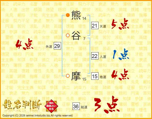 熊谷摩さんの天運は21画の5点!