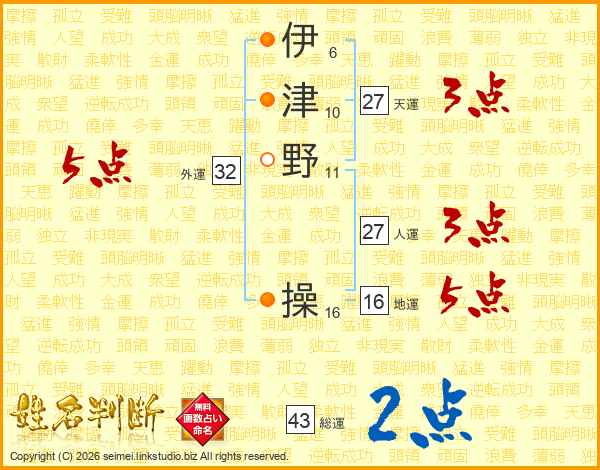 あなたの人生を表す1番重要な運勢です。生涯を通じて影響する総合運となり、主に50歳以降の晩年期に影響を及ぼします。苗字と名前の合計画数。