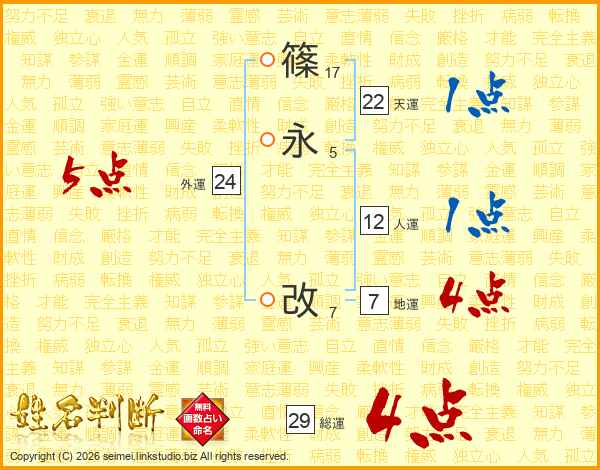 生活面を象徴する運勢です。外部から受ける影響力を表し、結婚運、家庭運や職場、環境への順応性を表します。総運から人運を引いた画数。姓や名が1文字の場合を除く。