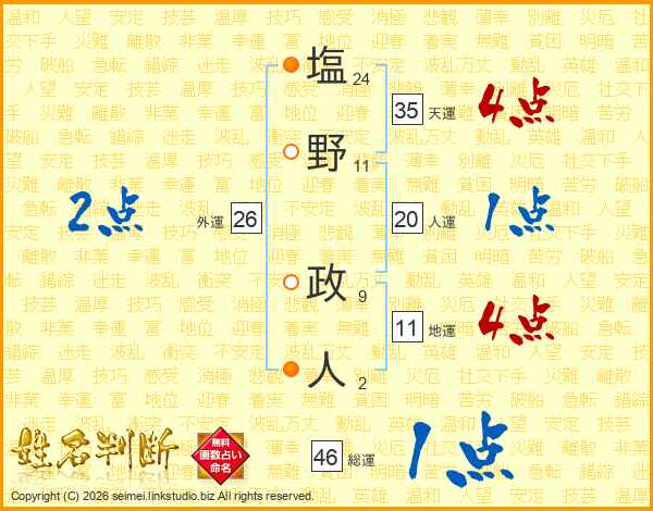 塩野政人さんの総運は46画の1点!