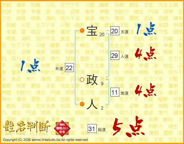 生活面を象徴する運勢です。外部から受ける影響力を表し、結婚運、家庭運や職場、環境への順応性を表します。総運から人運を引いた画数。姓や名が1文字の場合を除く。