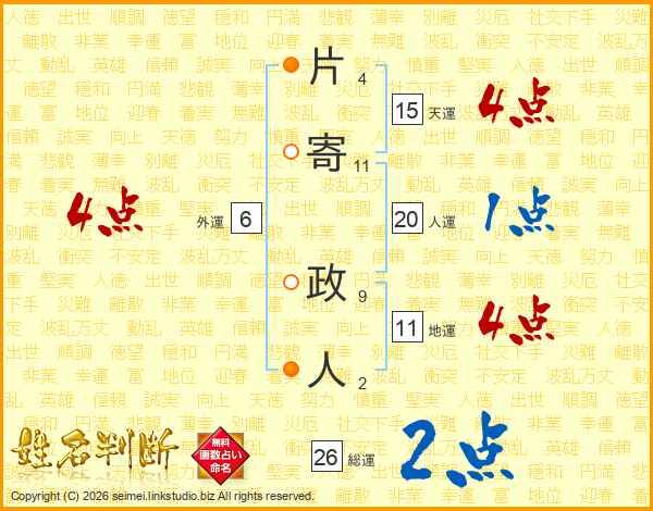 生活面を象徴する運勢です。外部から受ける影響力を表し、結婚運、家庭運や職場、環境への順応性を表します。総運から人運を引いた画数。姓や名が1文字の場合を除く。