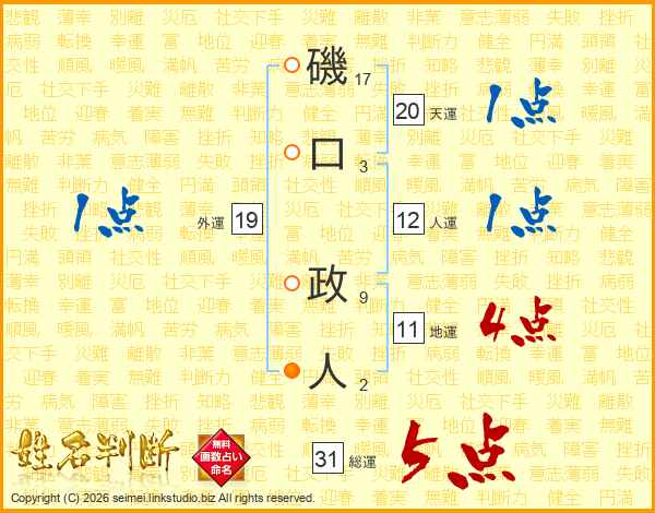 生活面を象徴する運勢です。外部から受ける影響力を表し、結婚運、家庭運や職場、環境への順応性を表します。総運から人運を引いた画数。姓や名が1文字の場合を除く。