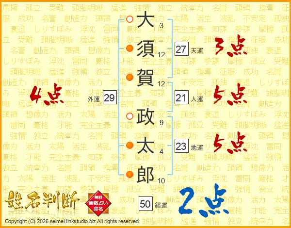 大(3画)須(12画)賀(12画) 政(9画)太(4画)郎(10画)