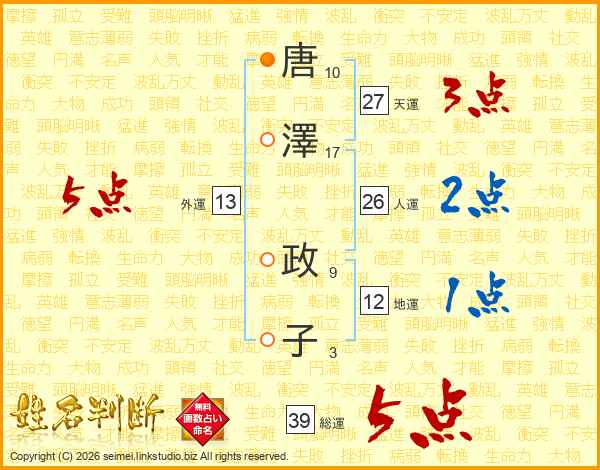 あなたの人生を表す1番重要な運勢です。生涯を通じて影響する総合運となり、主に50歳以降の晩年期に影響を及ぼします。苗字と名前の合計画数。