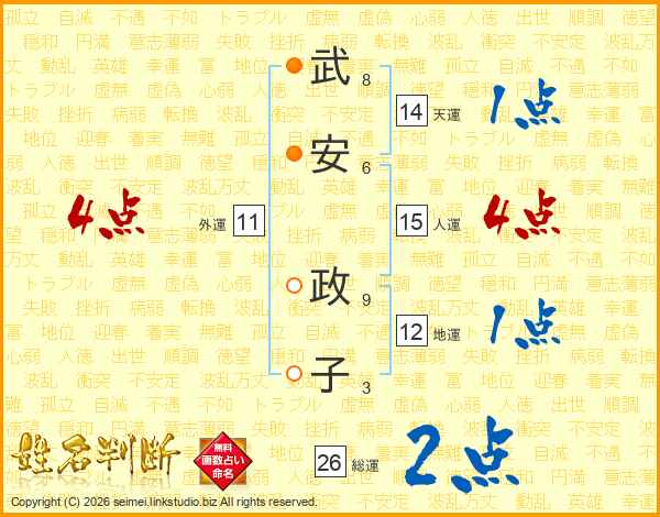 武(8画)安(6画) 政(9画)子(3画)