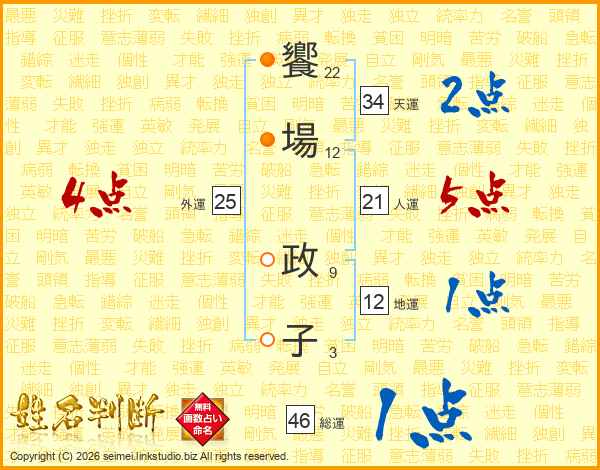 生活面を象徴する運勢です。外部から受ける影響力を表し、結婚運、家庭運や職場、環境への順応性を表します。総運から人運を引いた画数。姓や名が1文字の場合を除く。