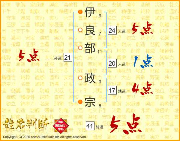 伊(6画)良(7画)部(11画) 政(9画)宗(8画)