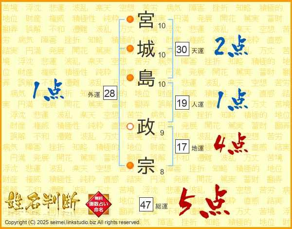 宮(10画)城(10画)島(10画) 政(9画)宗(8画)