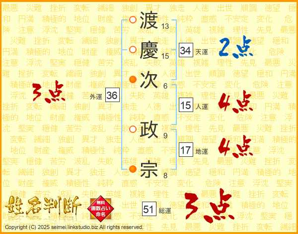渡(13画)慶(15画)次(6画) 政(9画)宗(8画)