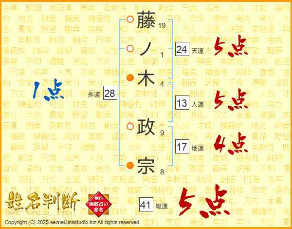 藤(19画)ノ(1画)木(4画) 政(9画)宗(8画)