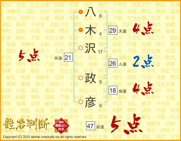 八(8画)木(4画)沢(17画) 政(9画)彦(9画)