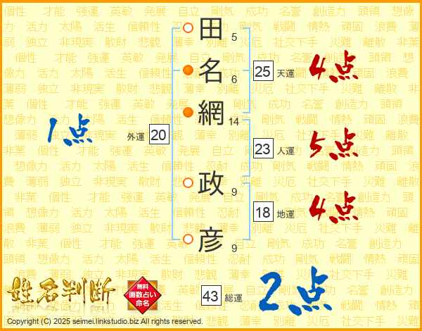 田(5画)名(6画)網(14画) 政(9画)彦(9画)