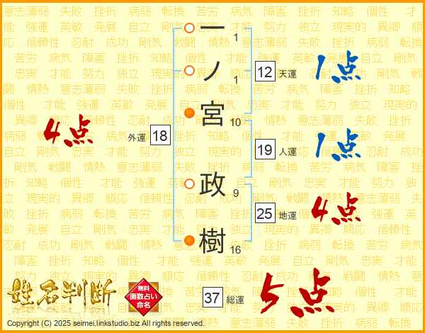 一(1画)ノ(1画)宮(10画) 政(9画)樹(16画)