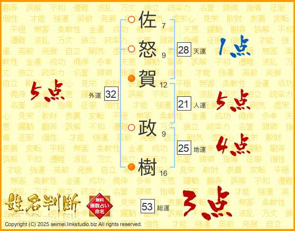 佐(7画)怒(9画)賀(12画) 政(9画)樹(16画)