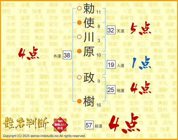 勅(11画)使(8画)川(3画)原(10画) 政(9画)樹(16画)