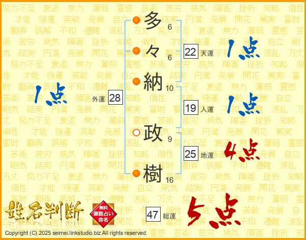 生活面を象徴する運勢です。外部から受ける影響力を表し、結婚運、家庭運や職場、環境への順応性を表します。総運から人運を引いた画数。姓や名が1文字の場合を除く。