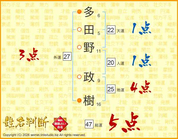 多(6画)田(5画)野(11画) 政(9画)樹(16画)