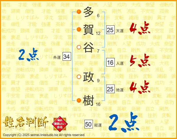 多(6画)賀(12画)谷(7画) 政(9画)樹(16画)