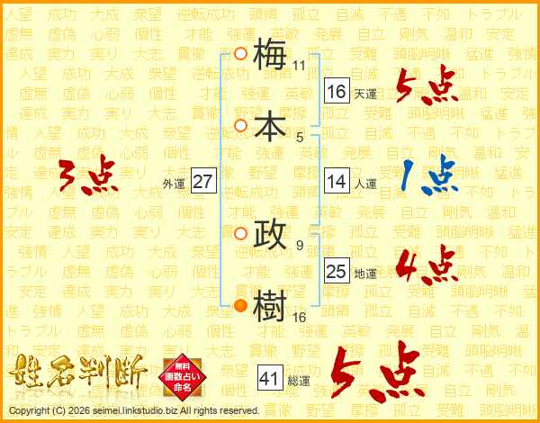 梅(11画)本(5画) 政(9画)樹(16画)