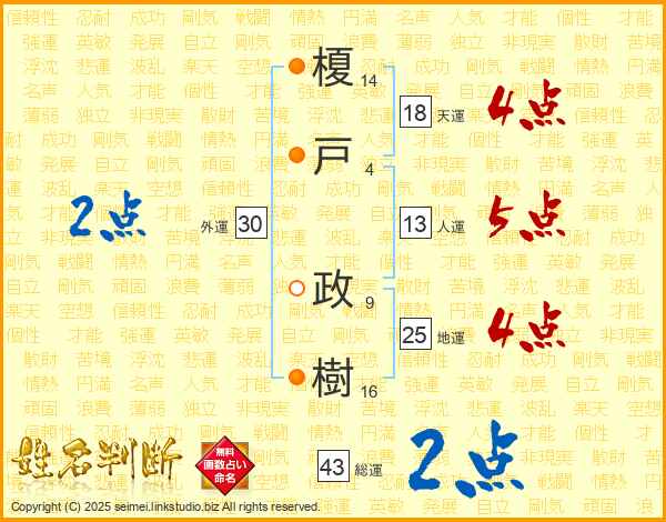 榎戸政樹さんの地運は25画の4点!