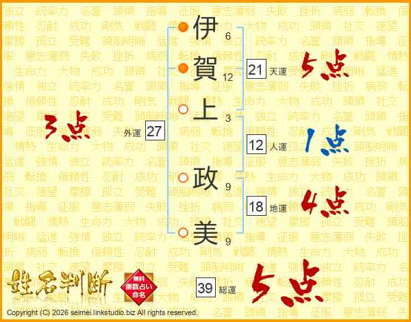 伊(6画)賀(12画)上(3画) 政(9画)美(9画)