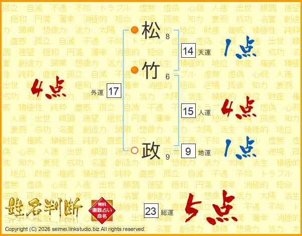 松竹政さんの人運は15画の4点!