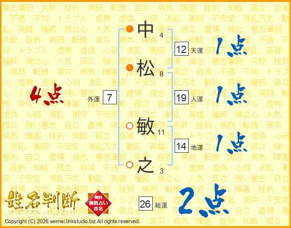 生活面を象徴する運勢です。外部から受ける影響力を表し、結婚運、家庭運や職場、環境への順応性を表します。総運から人運を引いた画数。姓や名が1文字の場合を除く。