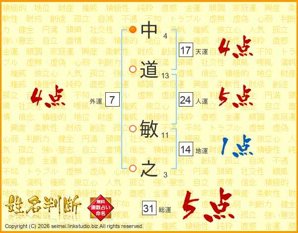 中道敏之さんの総運は31画の5点!