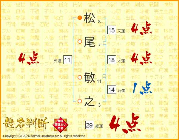 あなたの人生を表す1番重要な運勢です。生涯を通じて影響する総合運となり、主に50歳以降の晩年期に影響を及ぼします。苗字と名前の合計画数。