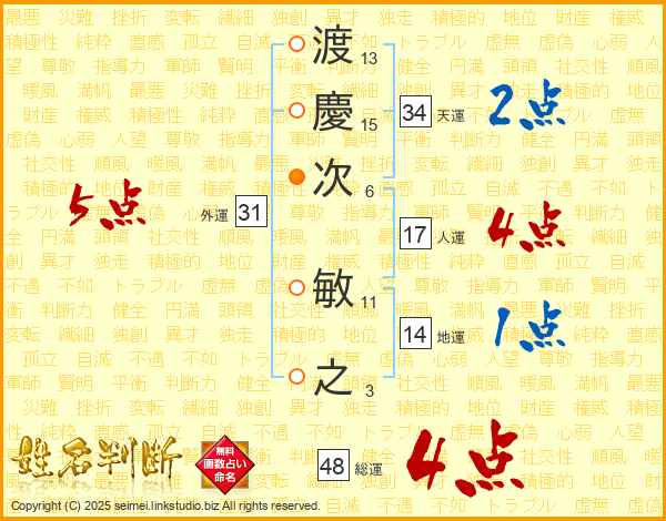 渡(13画)慶(15画)次(6画) 敏(11画)之(3画)