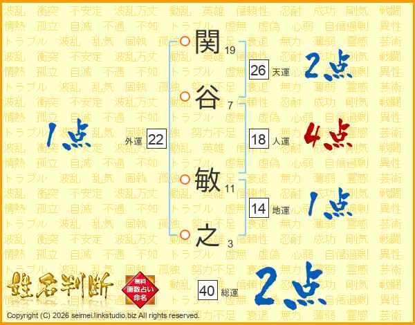生活面を象徴する運勢です。外部から受ける影響力を表し、結婚運、家庭運や職場、環境への順応性を表します。総運から人運を引いた画数。姓や名が1文字の場合を除く。