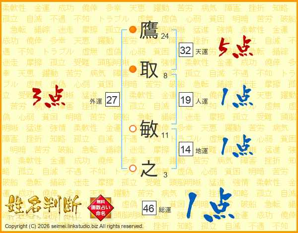 鷹取敏之さんの総運は46画の1点!