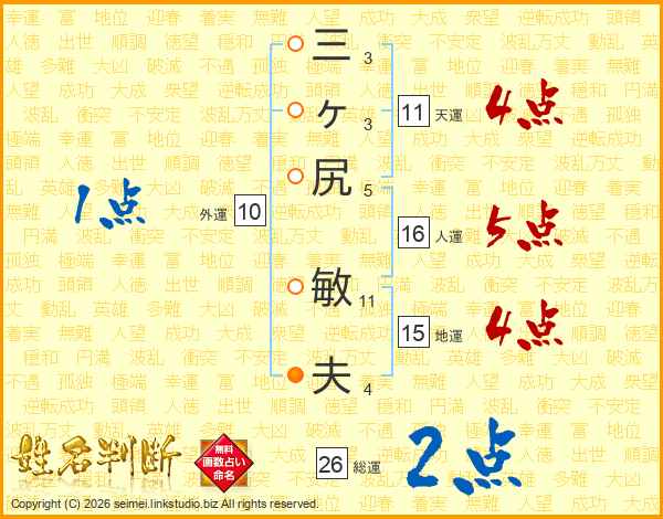 三(3画)ヶ(3画)尻(5画) 敏(11画)夫(4画)