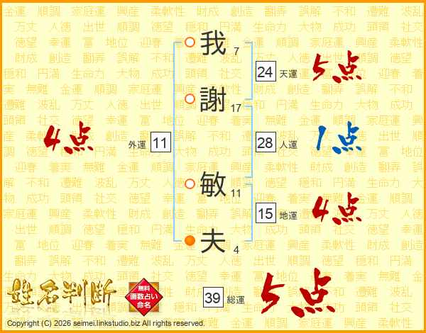 我(7画)謝(17画) 敏(11画)夫(4画)