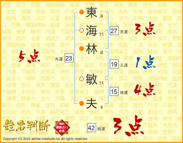 東(8画)海(11画)林(8画) 敏(11画)夫(4画)