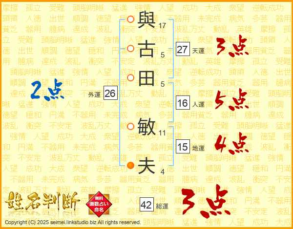 與(17画)古(5画)田(5画) 敏(11画)夫(4画)