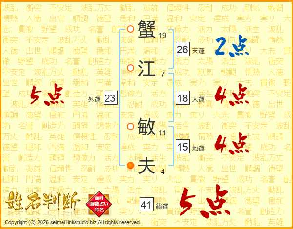 蟹(19画)江(7画) 敏(11画)夫(4画)