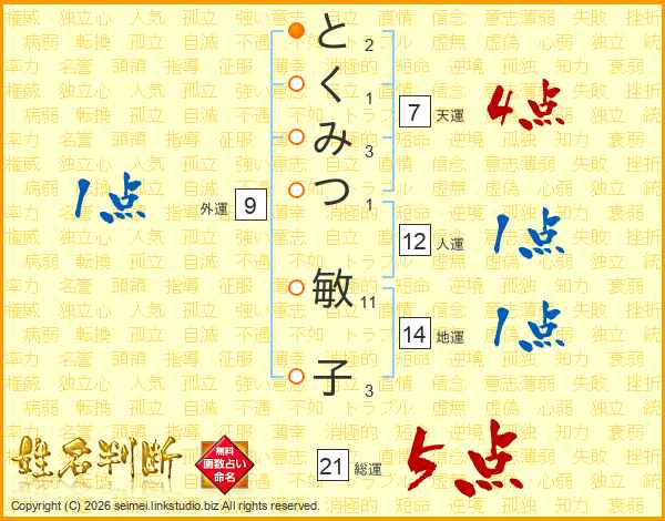とくみつ敏子さんの総運は21画の5点!