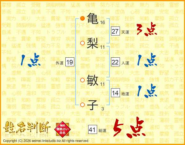 亀(16画)梨(11画) 敏(11画)子(3画)